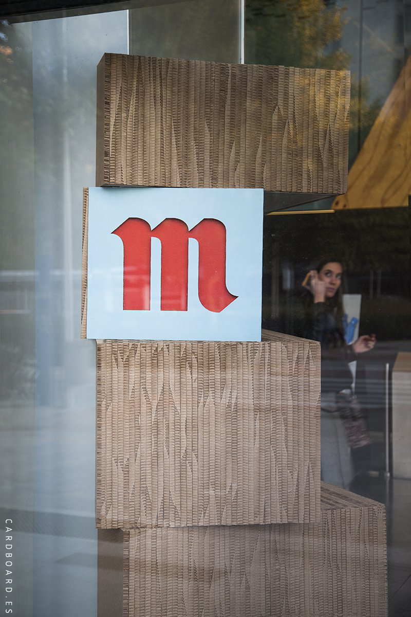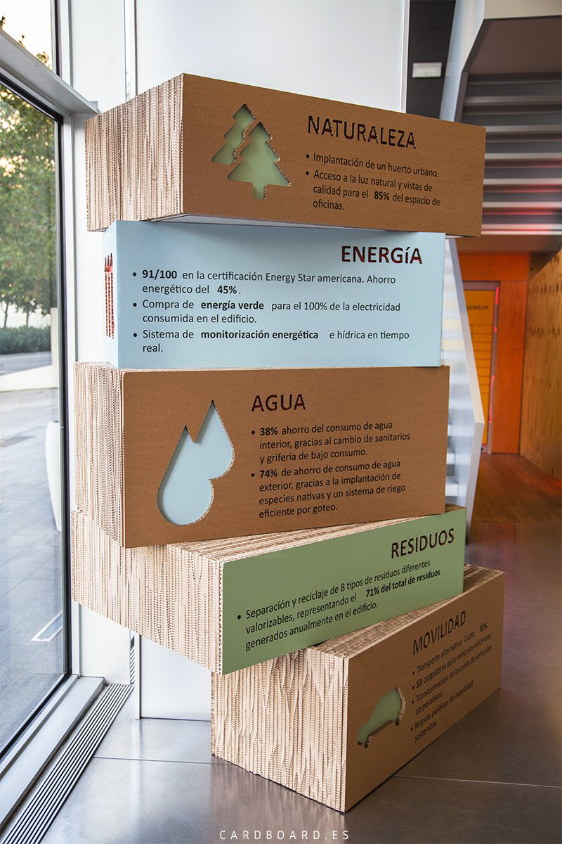 Realizados en su totalidad con cartón de 16mm de grosor jugando con el color del cartón en crudo, colores corporativos de la marca así como el verde en relación a la naturaleza y la sostenibilidad.