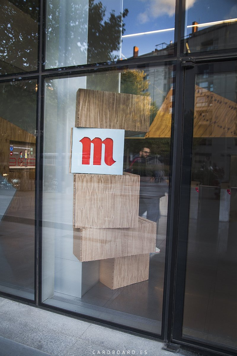 Realizamos para la Fundación Mahou esta decoración de cartón en el hall de entrada al edificio. En este caso la decoración en cartón se realizó sobre una de las columnas del hall recubriéndola totalmente con un juego de piezas en cartón.