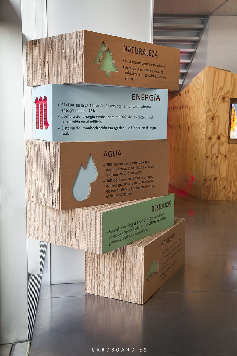 Como bien lo describen en su web Mahou San Miguel, compañía 100% española y líder del sector cervecero en nuestro país, avanza con su compromiso con la sostenibilidad, recibiendo el certificado en su sede corporativa de Madrid, el sello LEED Gold, motivo por el cual se realizó esta decoración de cartón interviniendo esta gran columna del hall principal.