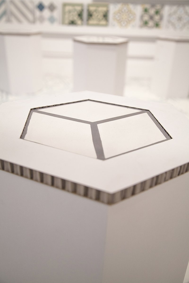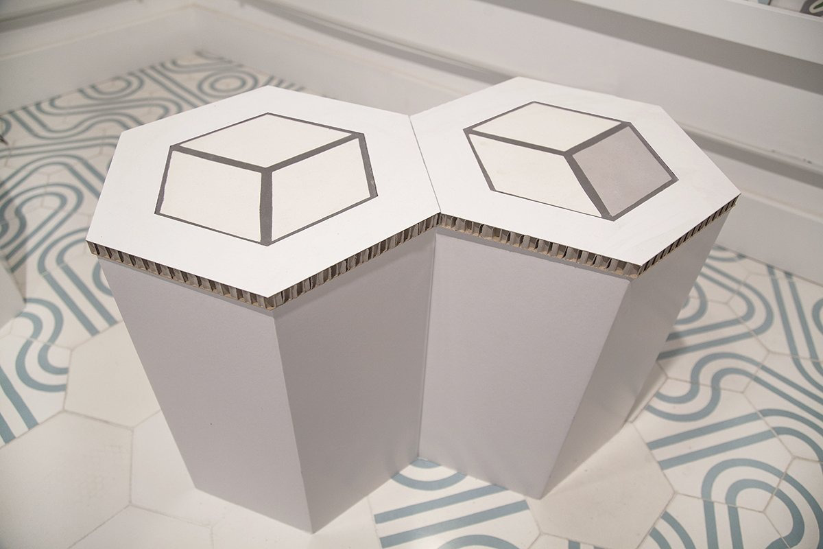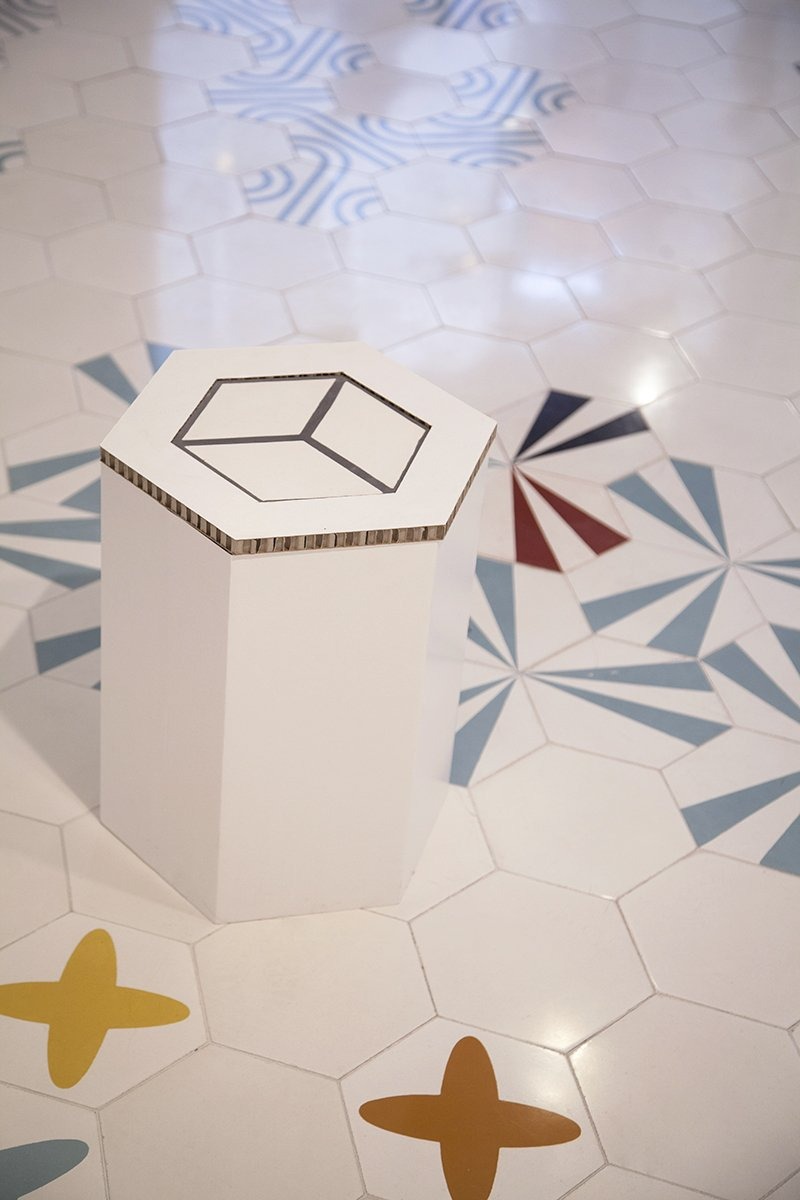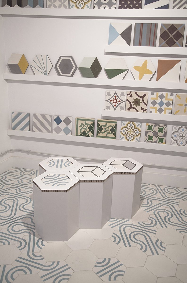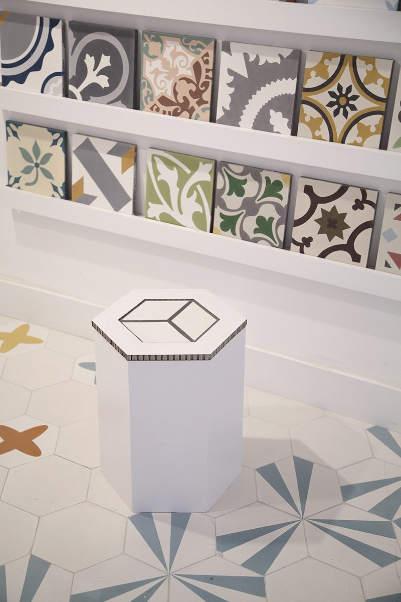 Mosaista nos encargó realizar este display de cartón hexagonal, una adaptación de nuestro modelo de taburete Hexa, para exponer inserto una de sus líneas de diseños de mosaico hidráulico Hexagon Mosaista.