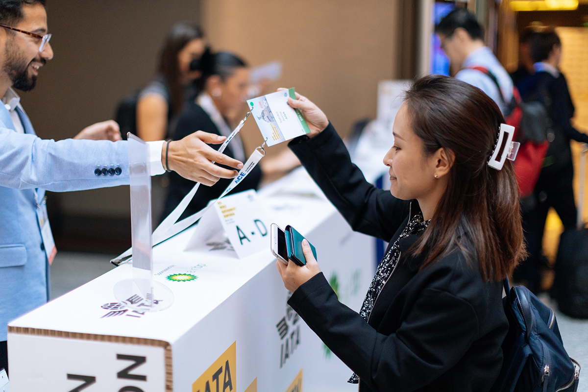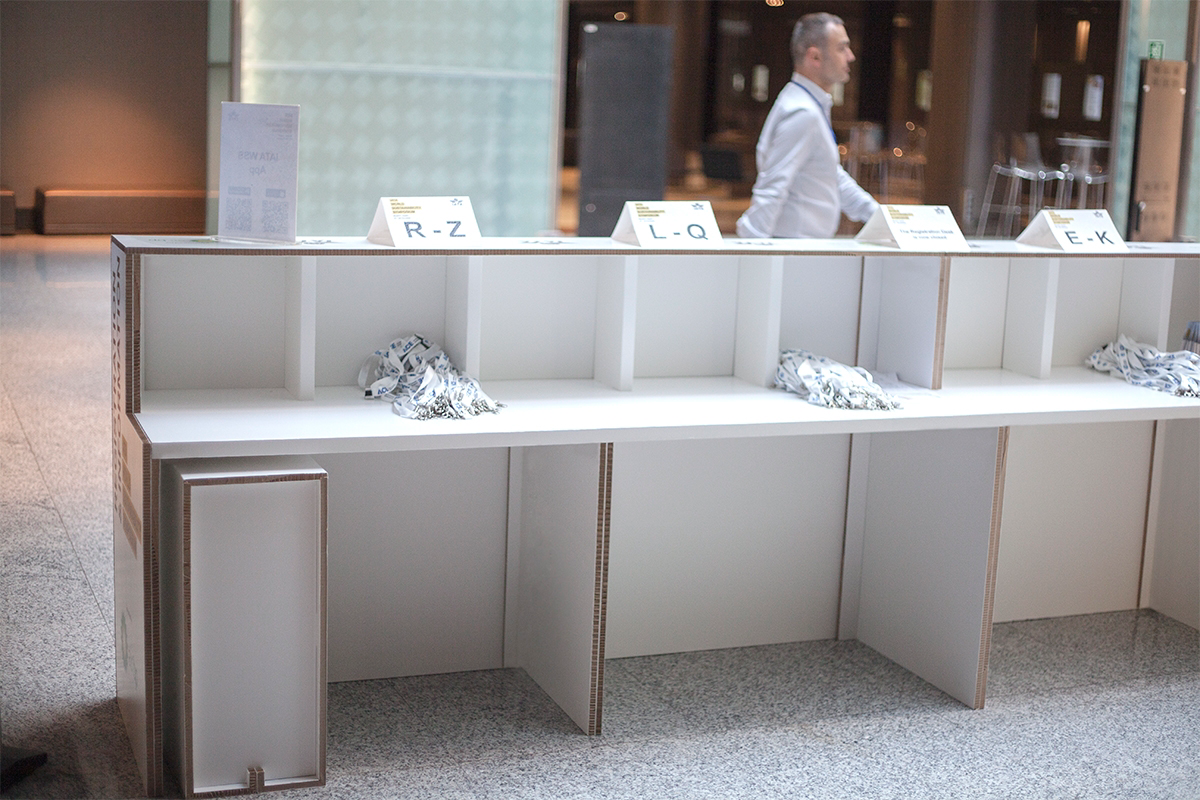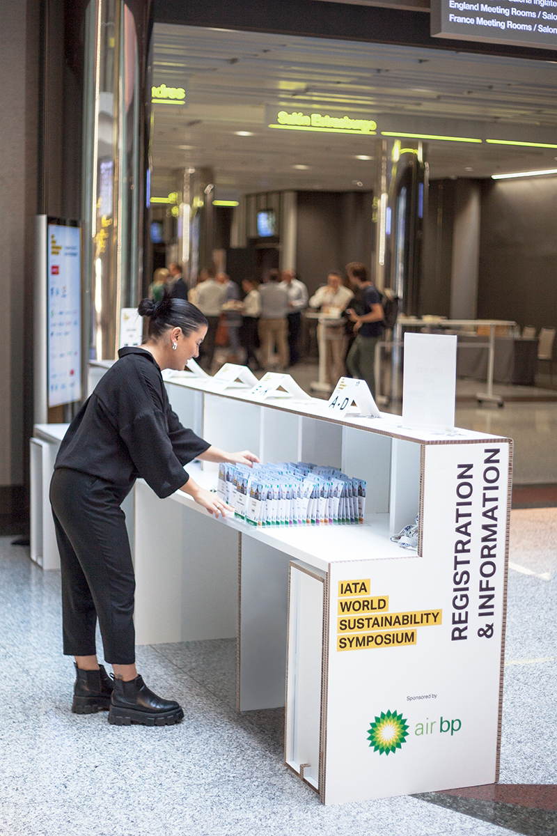 En un gran evento es fundamental disponer de un mostrador de cartón para recepción. La organización y recepción de los invitados requiere un espacio específico que permita poder gestionar el check in de todos ell@s. En este caso os presentamos este mostrador de cartón personalizado que diseñamos para el evento de IATA (Asociación Internacional de Transporte Aéreo).