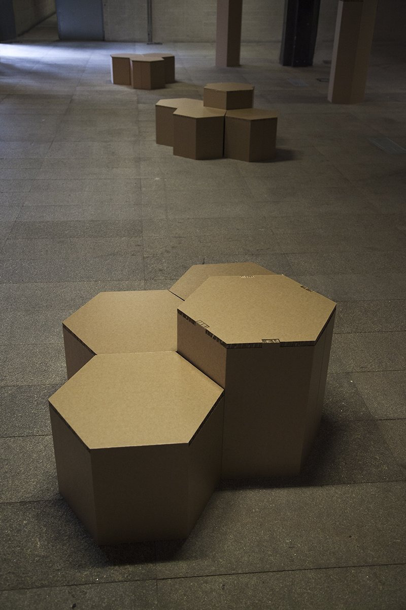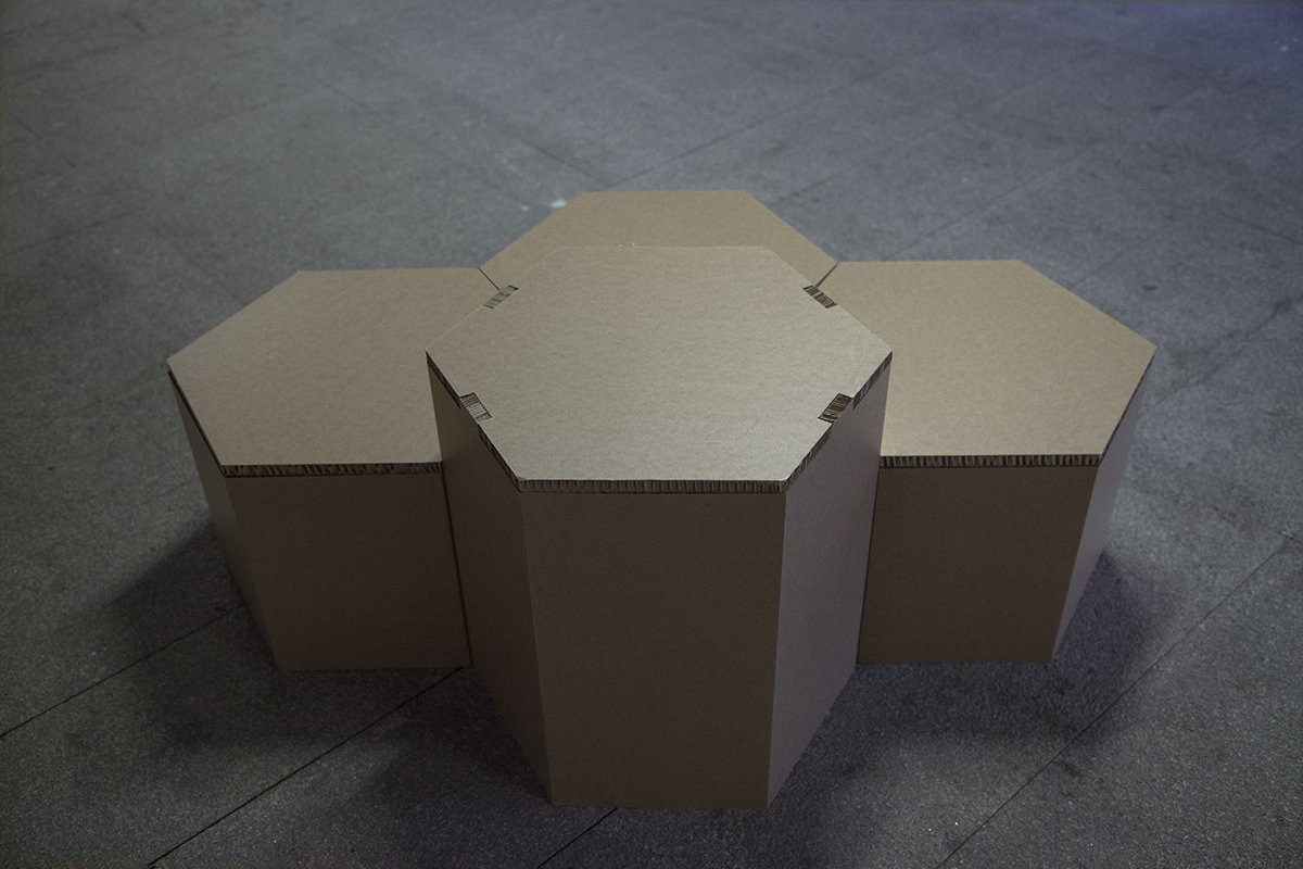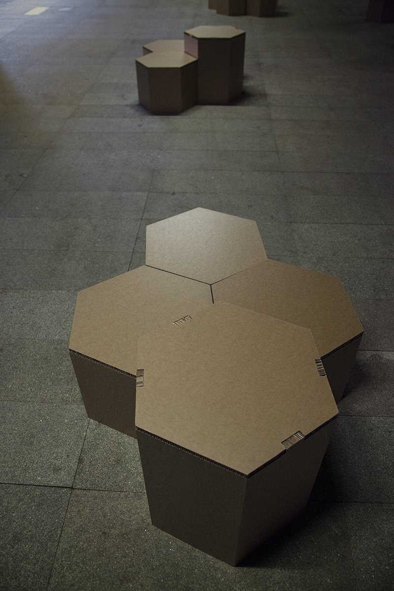 En estos muebles personalizados para evento corporativo se jugó con el motivo hexagonal, se diseñaron unas pequeñas islas a modo de zona de descanso con varias combinaciones de nuestros taburetes hexa.