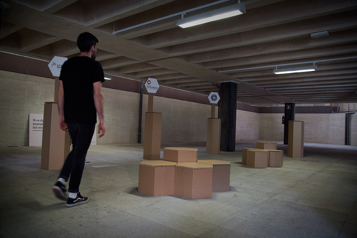 Muebles de cartón Triodos Bank personalizados para evento corporativo en el Colegio de Arquitectos Madrid.