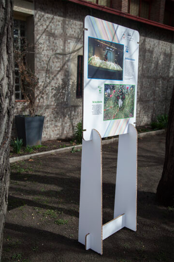 Con motivo de la exposición, nos encargaron diseñar unos paneles para exposiciones que debían ser muy ligeros, plegables y ocupar el mínimo espacio posible para transportarlos fácilmente entre sedes.