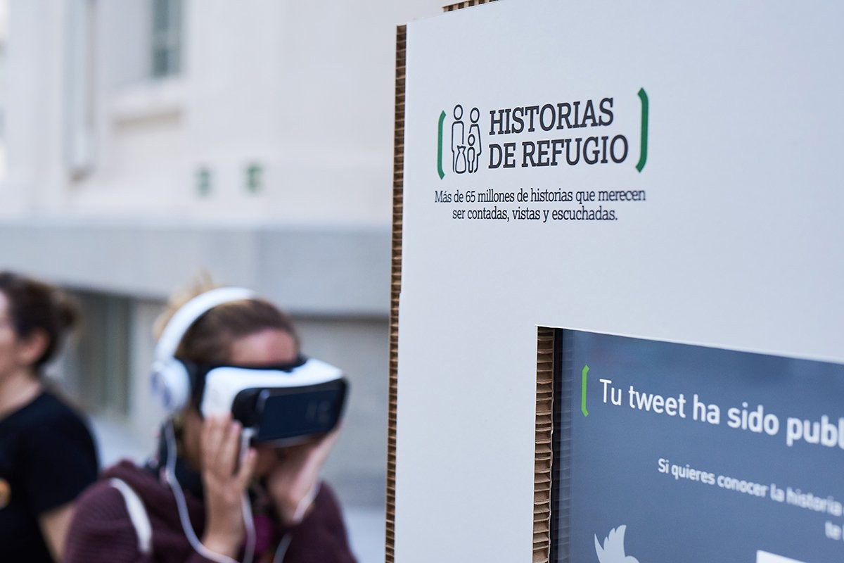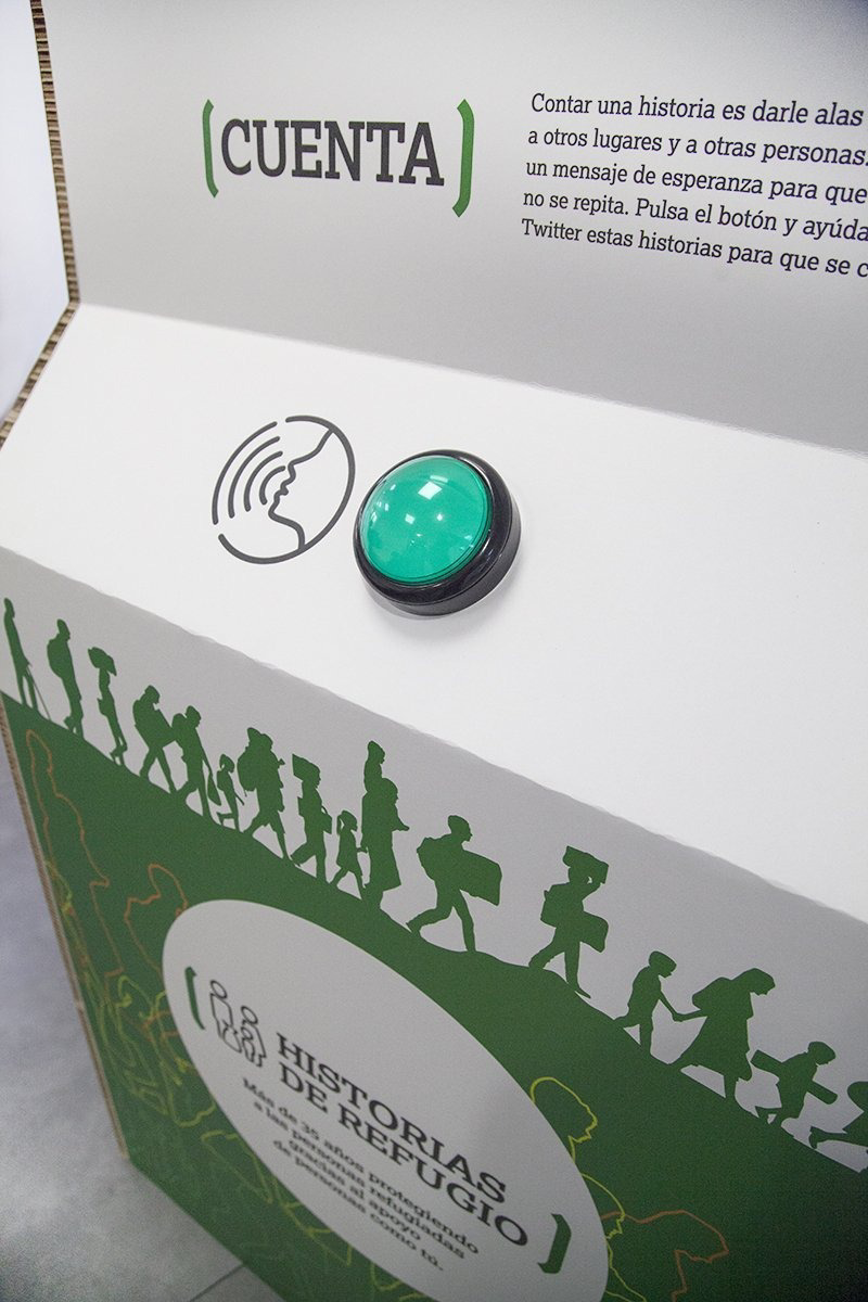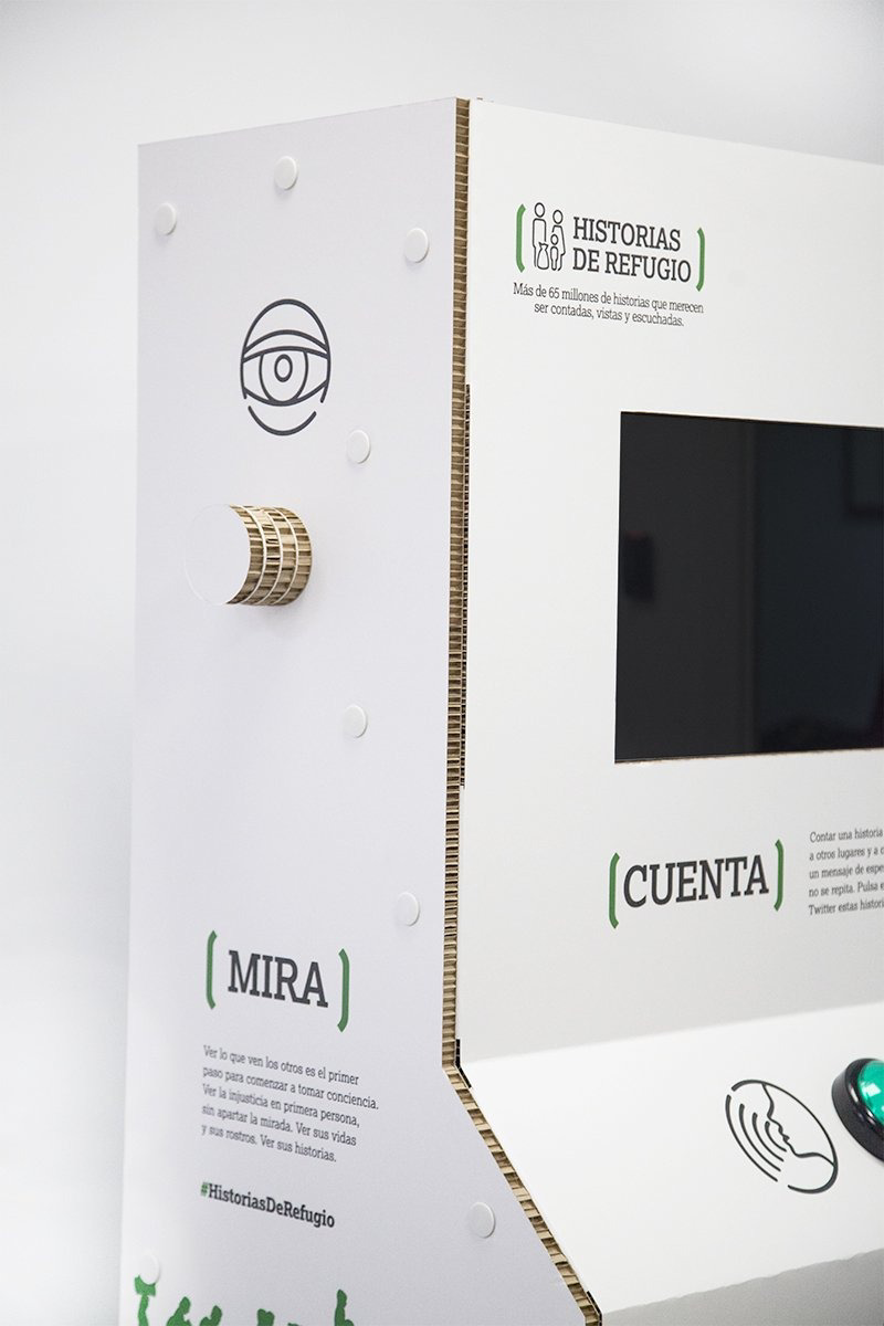 Además de esta interacción, en los laterales del totem hay unas gafas de realidad virtual y unos cascos con pista de audio para que el usuario se sumerja en las diversas historias que el cliente quería contar sobre la labor en cuanto a la ayuda al refugiado. En la parte frontal hay inserto un botón con el que poder realizar diferente acciones.