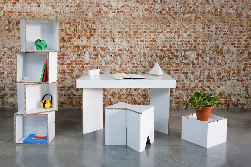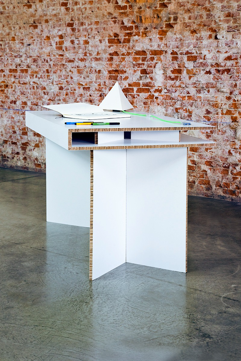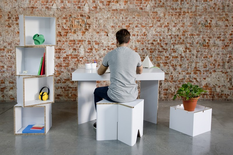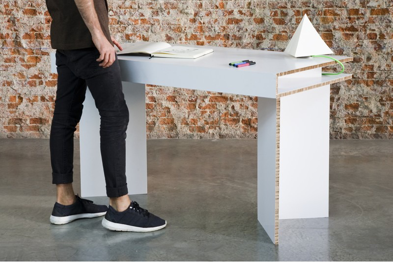 Es una mesa de cartón para oficina que se pliega en varios puntos para conseguir que ocupe menos espacio a la hora de guardar, almacenar o transportar. Está diseñado en tres sencillas piezas.