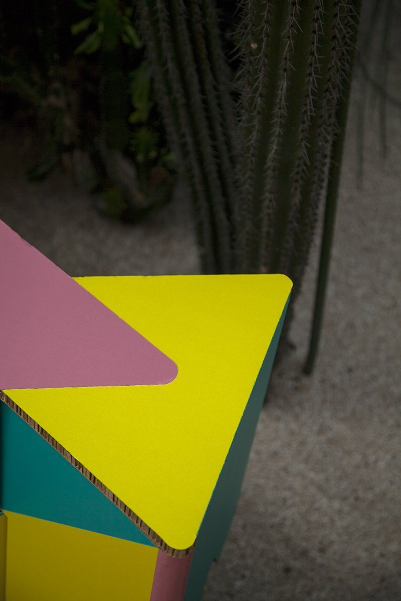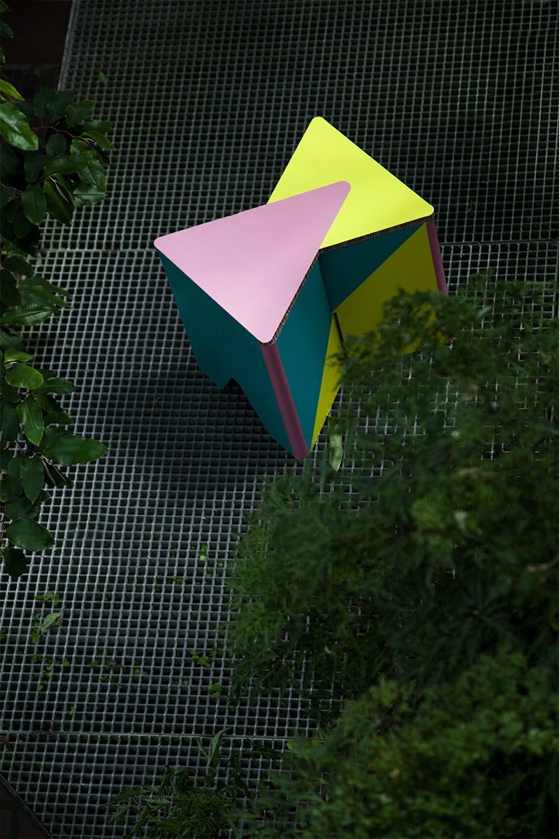 El taburete de cartón impreso INFIX se inspira en el símbolo matemático del infinito. Su estructura se forma con dos piezas triangulares abiertas que se entrelazan entre sí, generando una base sólida, estable y visualmente atractiva. Gracias a esta geometría, el taburete no solo es resistente, sino también muy fácil de montar y transportar.
