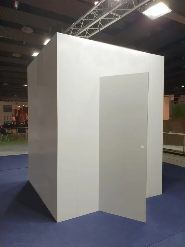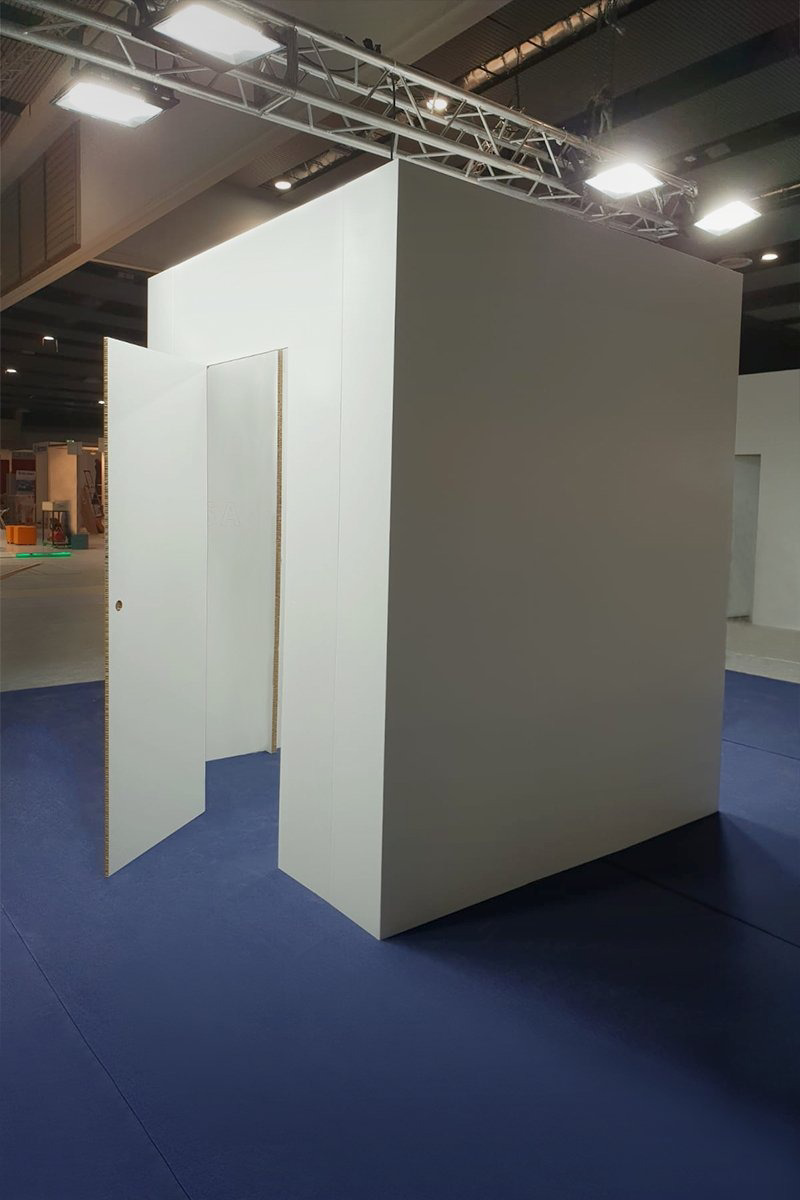 Diseñado con paneles modulares que permiten montar y desmontar rápidamente sin necesidad de herramientas ni tornillería, con un ensamblaje fácil e intuitivo. Podemos hacer el mismo concepto de almacén pero con otras medidas y forma, adaptándonos a las necesidades de cada proyecto y del tipo de Feria en el que se ubique.
