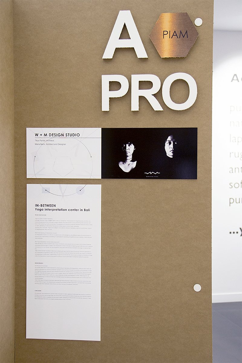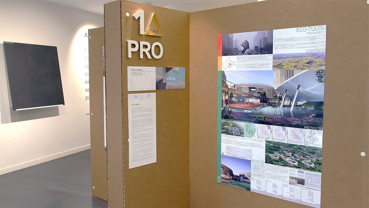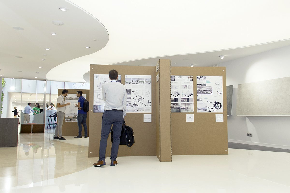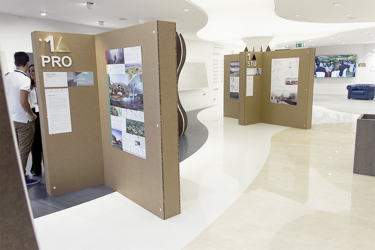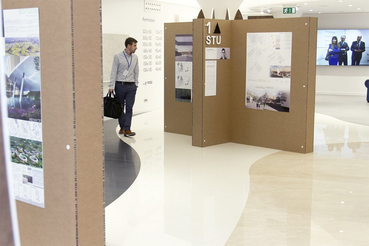 Los stands de cartón en cruz para exposición fueron diseñados de forma que cada cruz tenía 8 puestos independientes, presentando ocho proyectos en cada stand. Sobre las paredes de cada cruz los concursantes mostraban sus propuestas impresas todas sobre papel fotográfico. Además, la parte de títulos y nombres de proyectos estaban realizados también en cartón con diferentes acabados y formas totalmente integrados en cada propuesta.