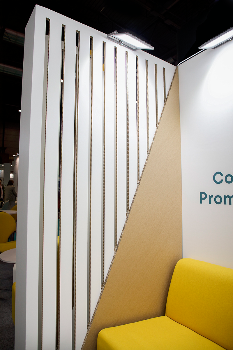 El espacio total del stand no era muy grande pero se consiguió crear distintas zonas de exposición, de reunión y recepción. Los paneles modulares de cartón permiten organizar el espacio según las necesidades.